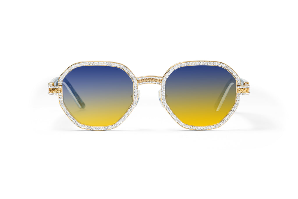 Super Bowl Edition (Rams) - Aunt Viv diamond crusted lunettes with custom marble Mazzucchelli Italian acetate, Nouvintage Baroque design 18k gold plated metal frame and highlighted by our limited edition BLUE Warriors lenses with a dynamic royal blue and yellow gradient.