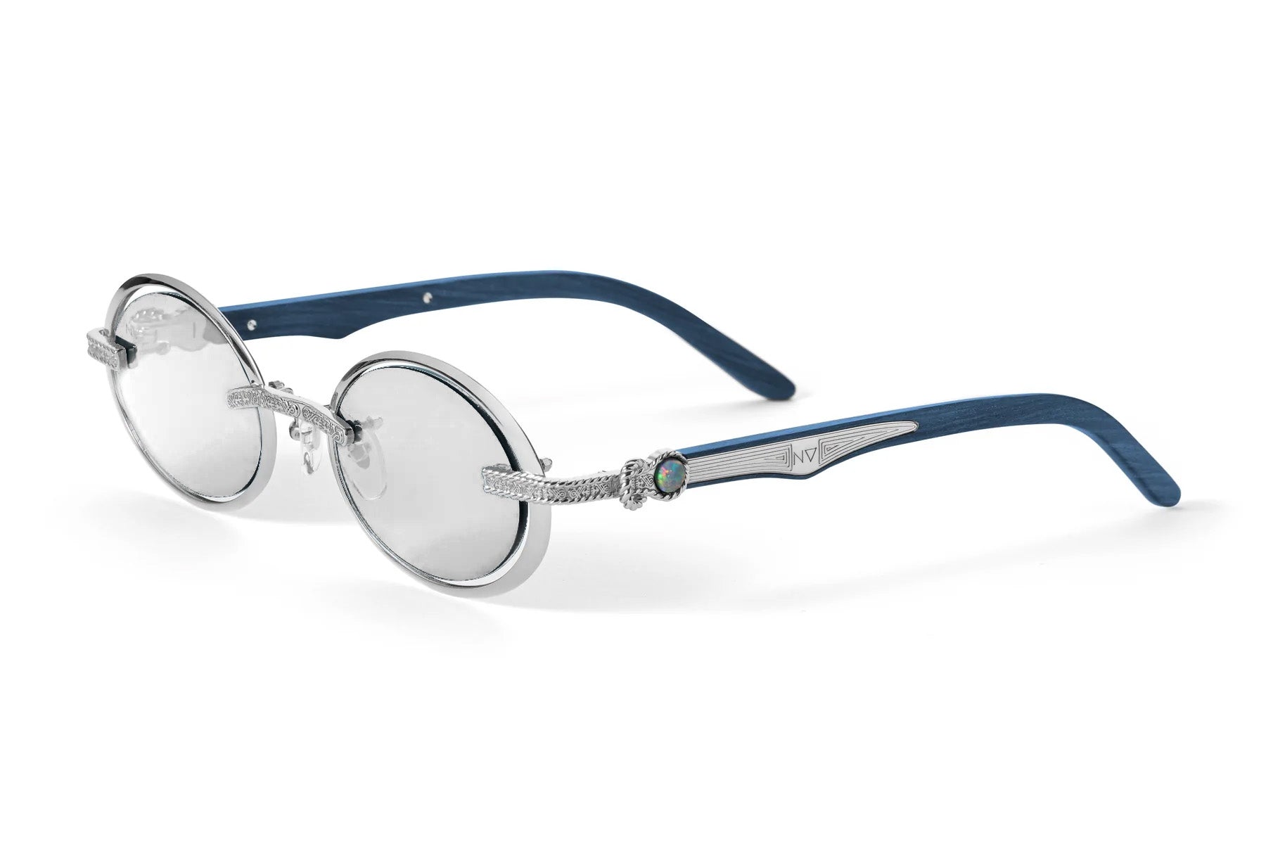 The 18 carat gold plated nautical rope embellishments at the hinges lay flat, embedded in the polished redwood temples. The gold is adorned with design and engraved with the Nouvintage insignia. They are singular and stylish. These frames include rare ellipse lenses, spring hinges and several vibrant holistic gemstone choices. The New Neo Waveson’s exude modern sophistication with an added touch of class.
