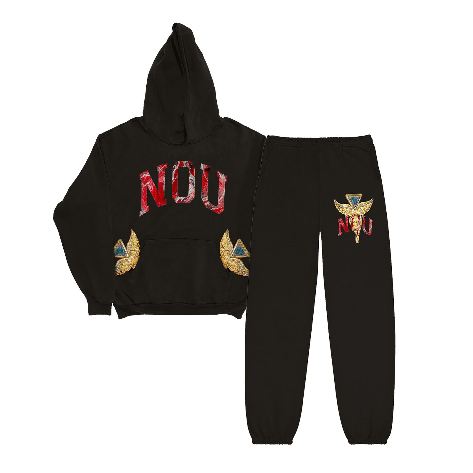 Trinity Set is a vintage-inspired, cotton sweat-set with a Victorian wash. The set includes a matching sweatshirt and sweatpants. The sweatshirt has a chenille patch hidden in the packets with the NOU print across the chest, while the sweatpants have a chenille patch with matching NOU print
